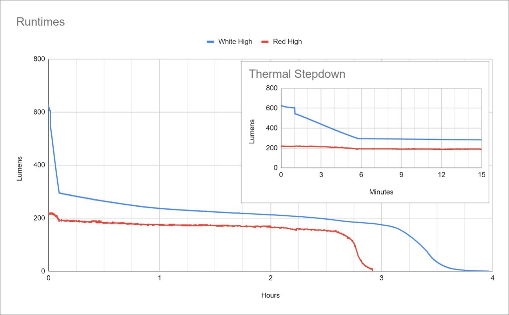 Thermal regulation: The light never even gets warm so I can’t imagine there’s any active thermal regulation. The stepdown present from 1 minute to 6 minutes must be timed. That’s not great and I would have liked for the light to stay brighter for longer, even if it gets a little warm.