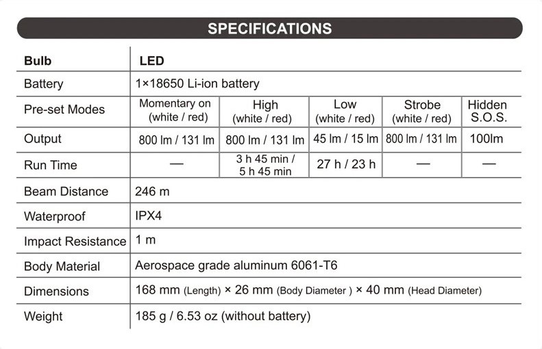 Disclaimer: All of my measurements are taken at turn-on. Lumen measurements were taken on a Texas Ace 3.5″ Lumen Tube. A candela measurement was taken at 10 meters with an Opple Light Master III on the highest brightness, and other candela figures were calculated relative to that. CRI, CCT, & DUV data was taken for each mode from a few feet away at the center of the hotspot with the Opple Light Master and Waveform DUV Calculator. Runtime tests were performed with the Ceilingbounce app on my smartphone. All of these tests were performed with a fully charged included battery unless otherwise specified. I cannot measure moonlight directly, so moonlight readings are calculated based on the brightness relative to the next-lowest mode. None of this is professional equipment, so take all of these measurements with a grain of salt.