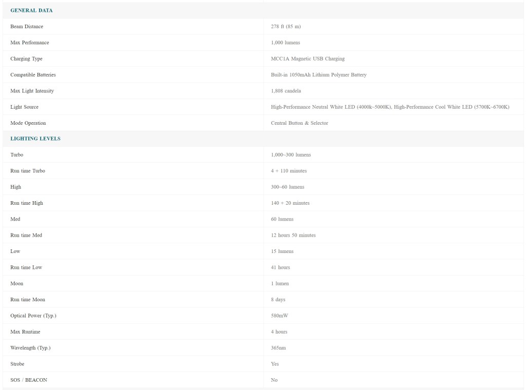 Disclaimer: All of my measurements are taken at turn-on. Lumen measurements were taken on a Texas Ace 3.5″ Lumen Tube. A candela measurement was taken at 10 meters with an Opple Light Master III on the highest brightness, and other candela figures were calculated relative to that. CRI, CCT, & DUV data was taken for each mode from a few feet away at the center of the hotspot with the Opple Light Master and Waveform DUV Calculator. Runtime tests were performed with the Ceilingbounce app on my smartphone. All of these tests were performed with a fully charged battery unless otherwise specified. I cannot measure moonlight directly, so moonlight readings are calculated based on the brightness relative to the next-lowest mode. None of this is professional equipment, so take all of these measurements with a grain of salt.