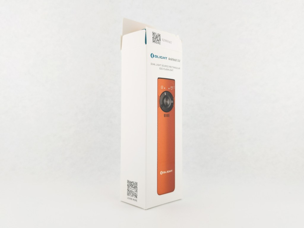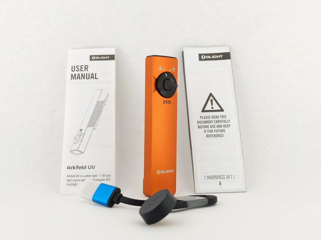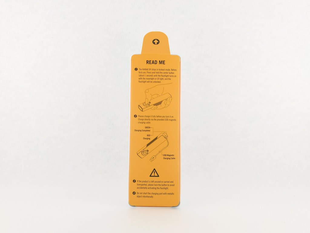 Arkfeld UV comes in the same style box as the original Arkfeld. It’s simple folded cardstock with some nice printing to show off the light and its specifications. It’s opened with a disposable pull tab on top so it cannot be closed back up once it’s opened. The following items are included in the box: