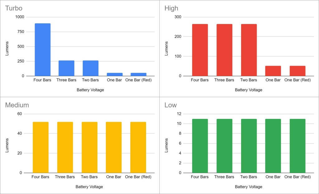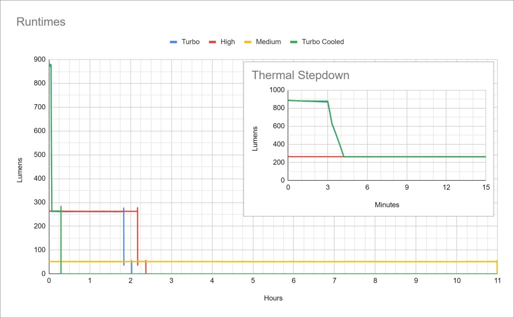 Thermal regulation: The cooled and un-cooled Turbo runtime tests are identical, which means this light has zero thermal active thermal regulation. It’s just a 1-minute timed stepdown from Turbo to High and that’s it. That makes it very predictable but it also means it’s possible for it to overheat in adverse conditions or to leave some performance on the table in ideal conditions.