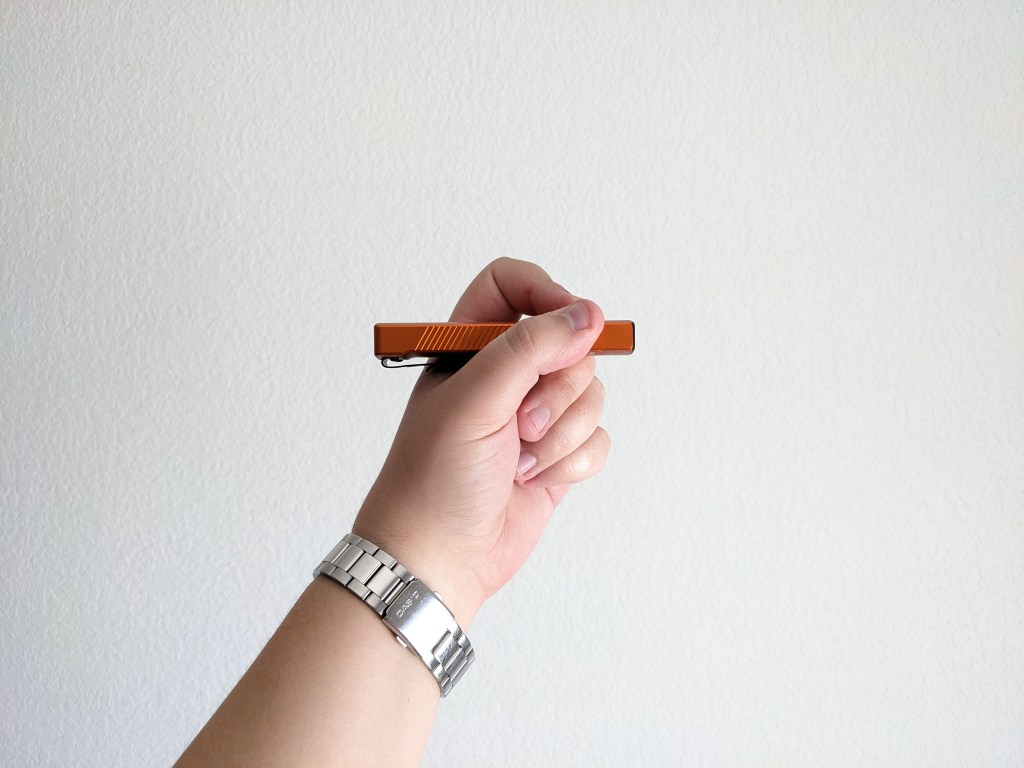 Arkfeld UV’s ergonomics are excellent. It fits nicely in the hand just like a small TV remote control. My thumb lands naturally on the button in a forward grip. I can also hold and use it in a pencil-ish grip with my index finger on the button. The extra milling on the side adds a little bit more grip but is not aggressive.