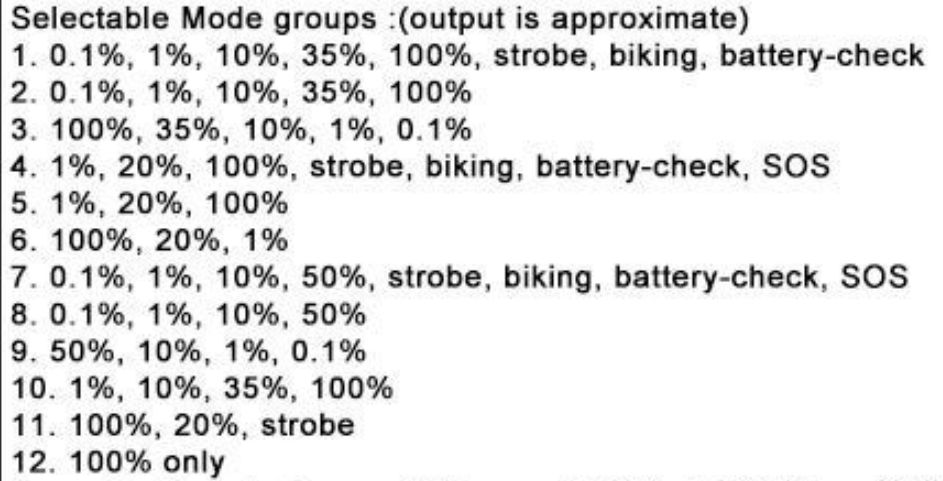 This 12-group firmware has a variety of modes organized into 12 mode-groups. You can choose any one of those 12 mode-groups and even enable/disable mode memory if you choose. Those are really nice features.