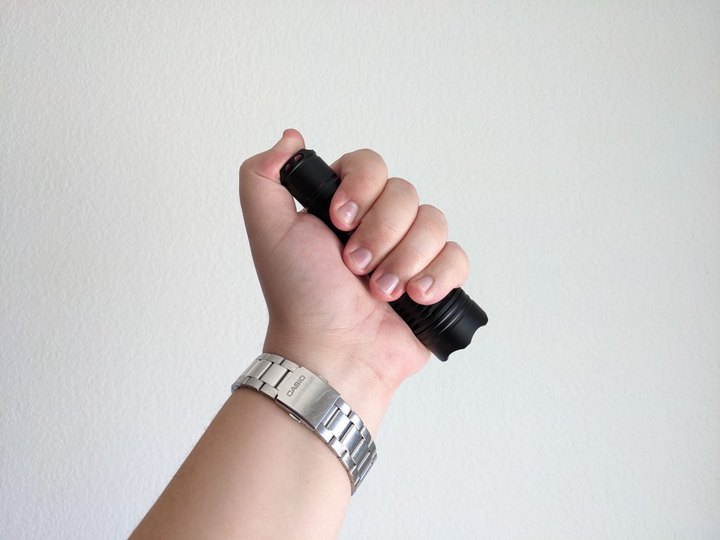 M1’s ergonomics are pretty good. It fits well in a forward, reverse, or cigar grip. There aren’t any sharp edges and it’s a great size for handheld use.