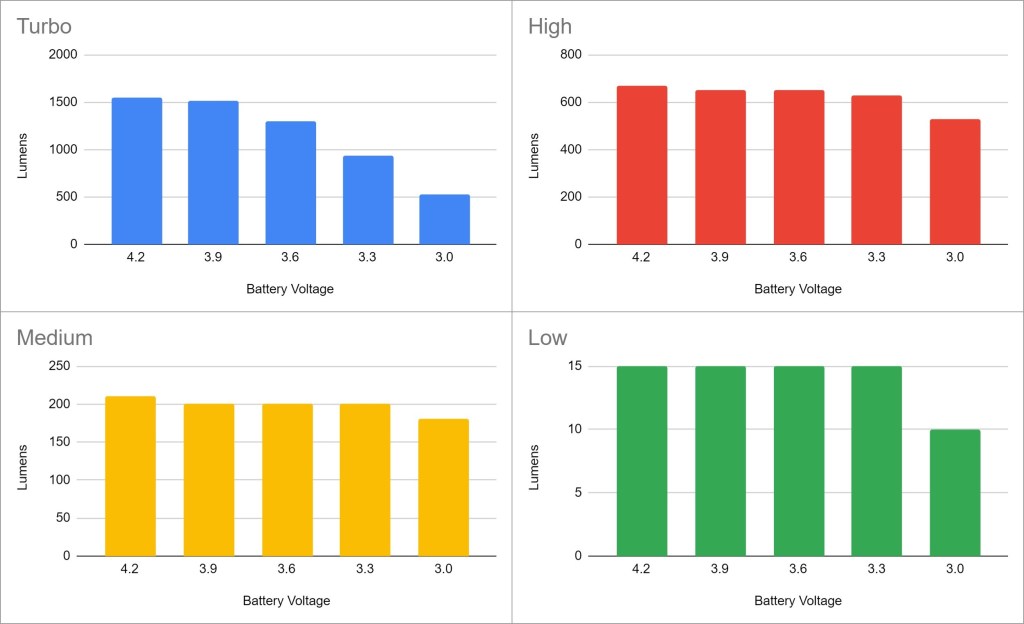 Disclaimer: All of my measurements are taken at turn-on. Lumen measurements were taken on a Texas Ace 3.5″ Lumen Tube. A candela measurement was taken at 10 meters with an Opple Light Master III on the highest brightness, and other candela figures were calculated relative to that. CRI, CCT, & DUV data was taken for each mode from a few feet away at the center of the hotspot with the Opple Light Master and Waveform DUV Calculator. Runtime tests were performed with the Ceilingbounce app on my smartphone. All of these tests were performed with a fully charged Molicel M35A battery unless otherwise specified. I cannot measure moonlight directly, so moonlight readings are calculated based on the brightness relative to the next-lowest mode. None of this is professional equipment, so take all of these measurements with a grain of salt.