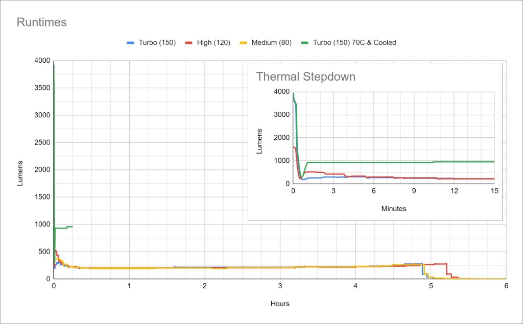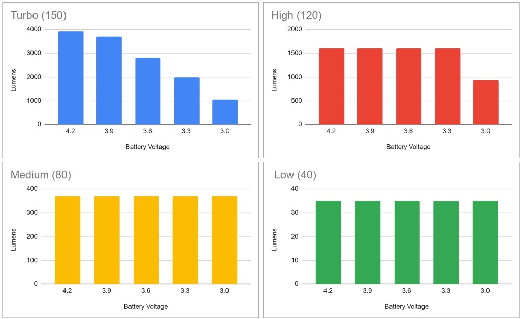 LVP (Low Voltage Protection): Anduril 2 will lower the brightness in noticeable steps when the battery gets low. When the battery is empty it will shut the light off completely. You can still turn it back on briefly for emergencies though. It’s very good at extending battery life when the cell is low, so I didn’t wait for it to fully shut off in any of my tests to save time.