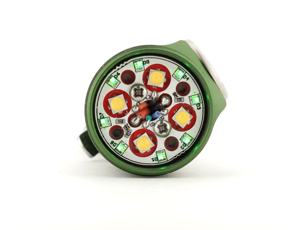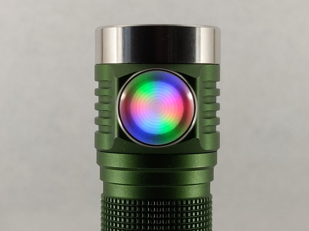 Aux LED’s: There are eight RGB auxiliary emitters behind the TIR optic in the front of the light. There are also lights behind the switch which can be RGB or a fixed color. They’re all controlled by the aux LED function in Anduril 2. They can be set to one of 10 different colors/color paterns, one of three different color patterns, and one of four brightness levels/paterns. They’re very cool looking and add some nice flare to the light. You can also use them to locate the light in the dark or tell how charged the battery is at a glance, but they aren’t good for illuminating other objects.