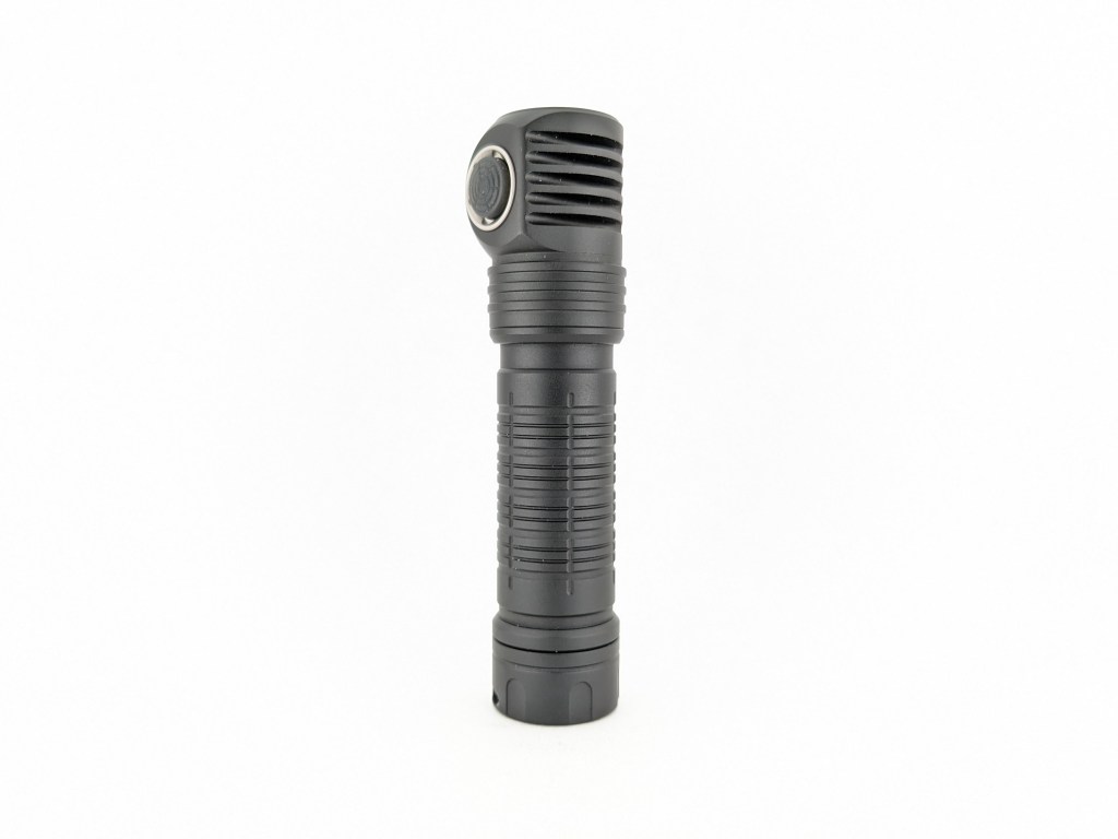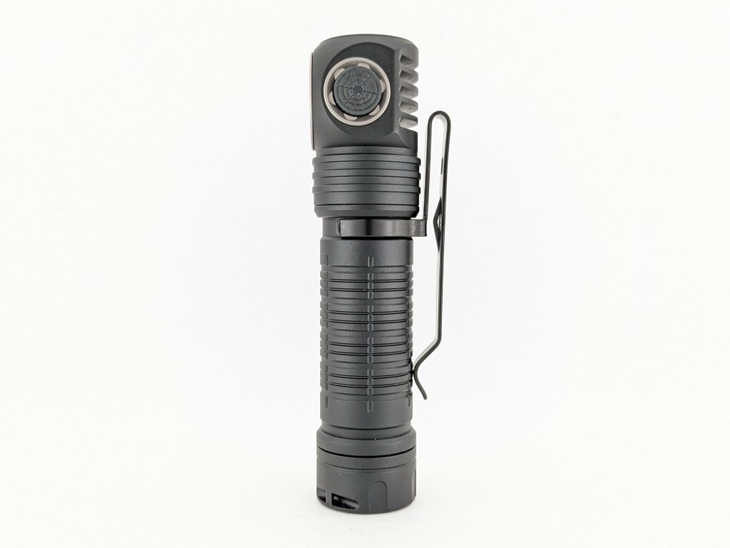 The design is in line with Skilhunt’s other headlamps. It’s a narrow body tube with a slightly flared tailcap and right-angle head. The button is on the side and a magnetic charging contact is on top. It’s a bit funny looking but very functional. I like the silver accents from the retaining rings.