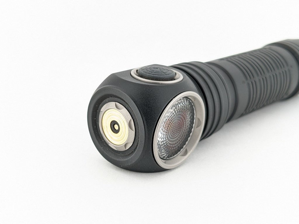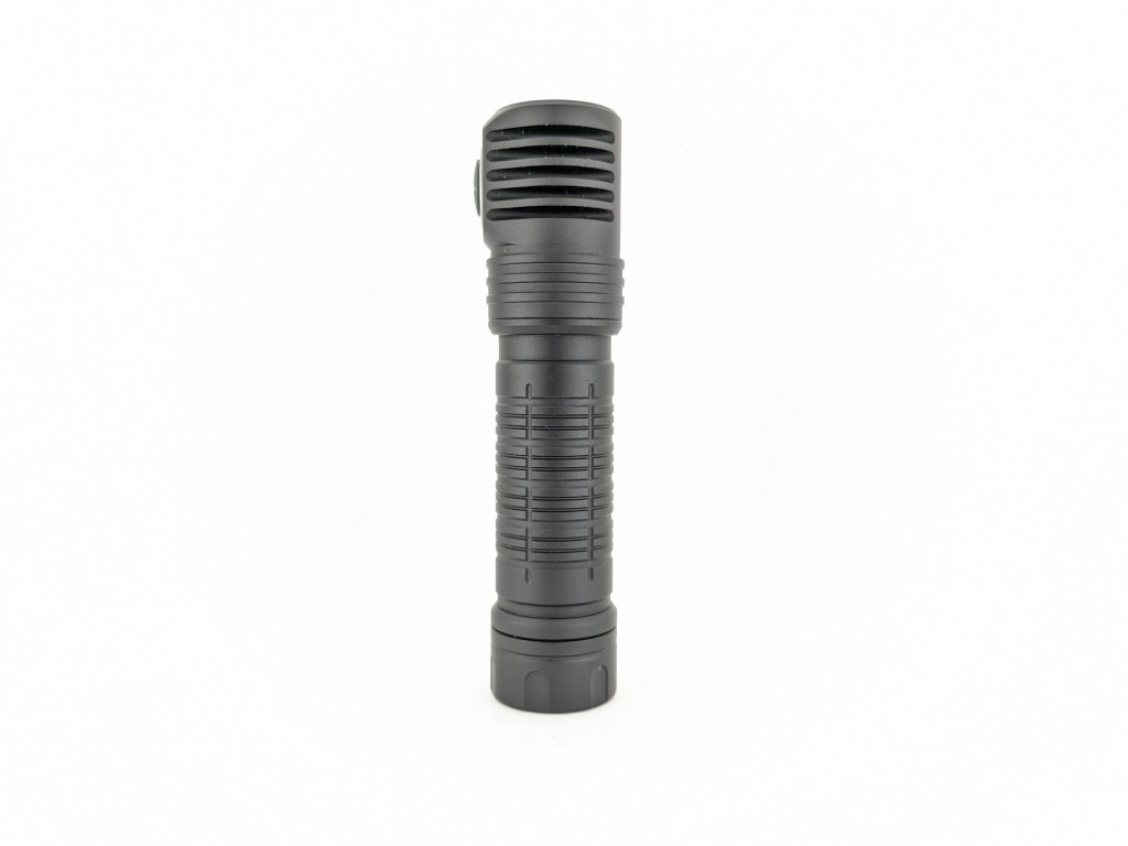 H300 uses an electronic switch mounted on the side of the head, rather than at the top of the head like many right-angle lights. This switch placement isn’t as good for handheld use but it’s much better for headlamp use. It positions the switch to be pinched between the user’s index finger and thumb, the most ergonomic switch position for a headlamp.