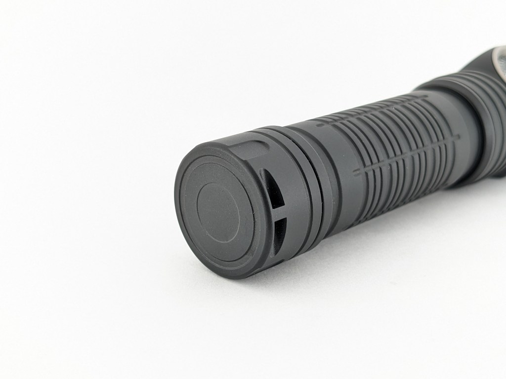 The switch is covered by a translucent rubber boot, and there’s a backlight underneath that serves as a battery indicator. It lights up for 5 seconds after the light is activated. Constant blue means the light is 80-100% charged. Blinking blue means the light is 50-80% charged. Constant red means 20-50% charge. Blinking red means 0-25% charge and it will continue blinking until the light is turned off. This battery indicator system requires a little bit of memorizing but it does work.