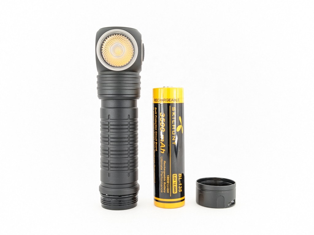 A single 18650 battery is optionally included. It’s protected, button-topped, Skilhunt-branded, rated at 3500mah, and well-suited to this light. I also tried an unprotected button top cell, but the light would shut off any time it was jostled due to the shorter battery.