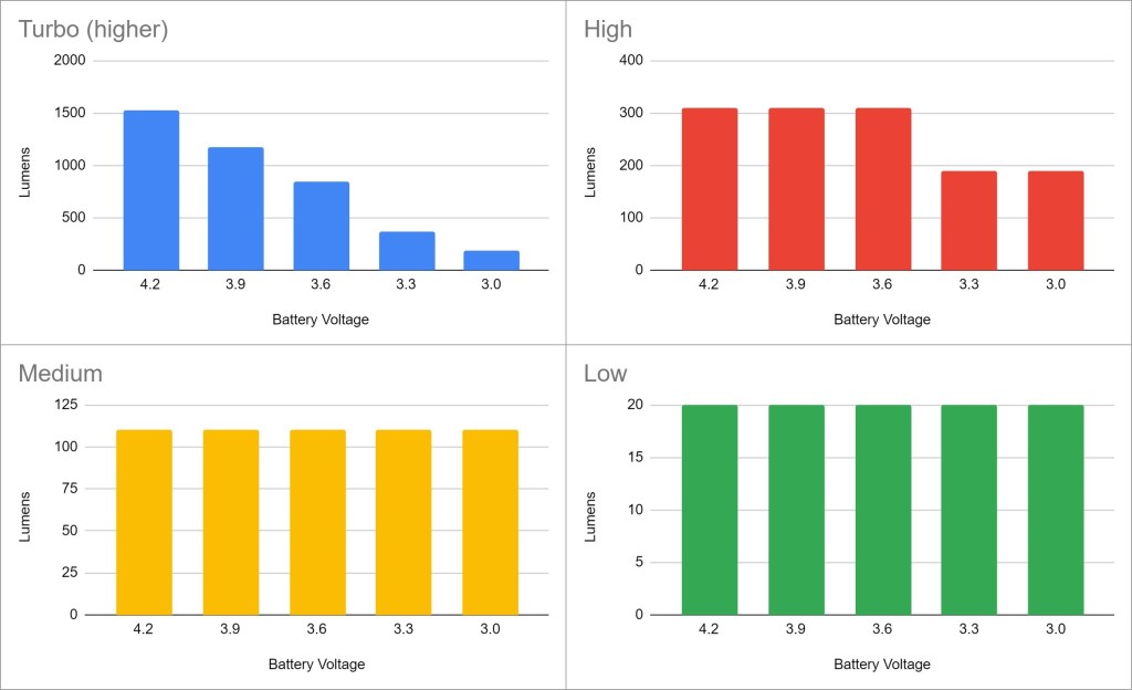 Regulation is average. Turbo is heavily affected by battery voltage and High is moderately affected. The other modes are unaffected. I hoped for a little bit better regulation since this is a boost driver, but this is totally acceptable.