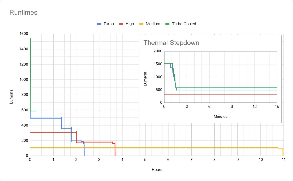 Performance: Turbo lasts for about 1 minute before stepping down to 500 lumens. That sustained output of 500 lumens is very impressive for such a small light with such a high CRI LED. High mode steps down by ~100lm in the middle of its runtime, which is odd. It’s also reflected in the regulation testing below.