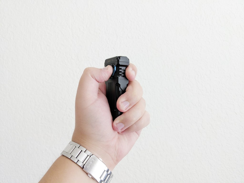 X2 fits really well in the hand for its size. Most small lights are a little fiddly to hold but this one sits securely. All the angles and machining on the body are actually contoured to the hand. It’s very comfortable to hold and use in a forward grip.