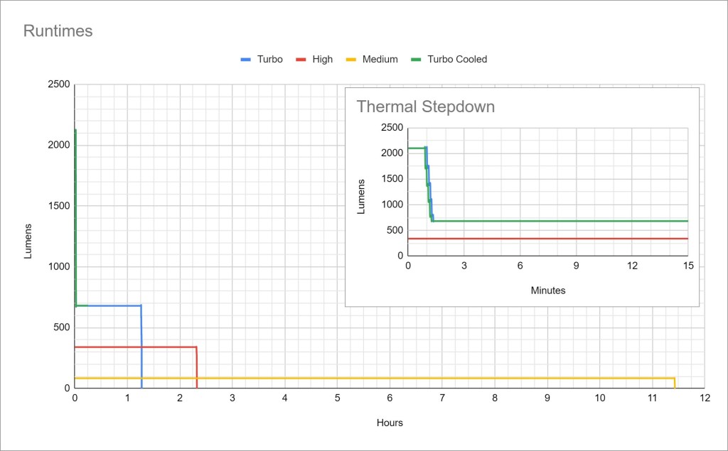 Thermal regulation: There is no active thermal regulation here. There is only a timed step-down at 1 minute on Turbo mode. That means the light will perform very consistently but may also overheat in hot weather or leave some performance on the table in cold weather.