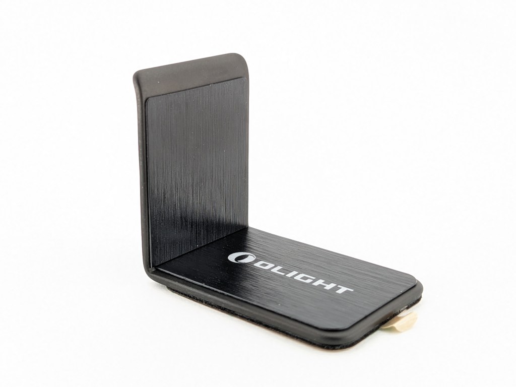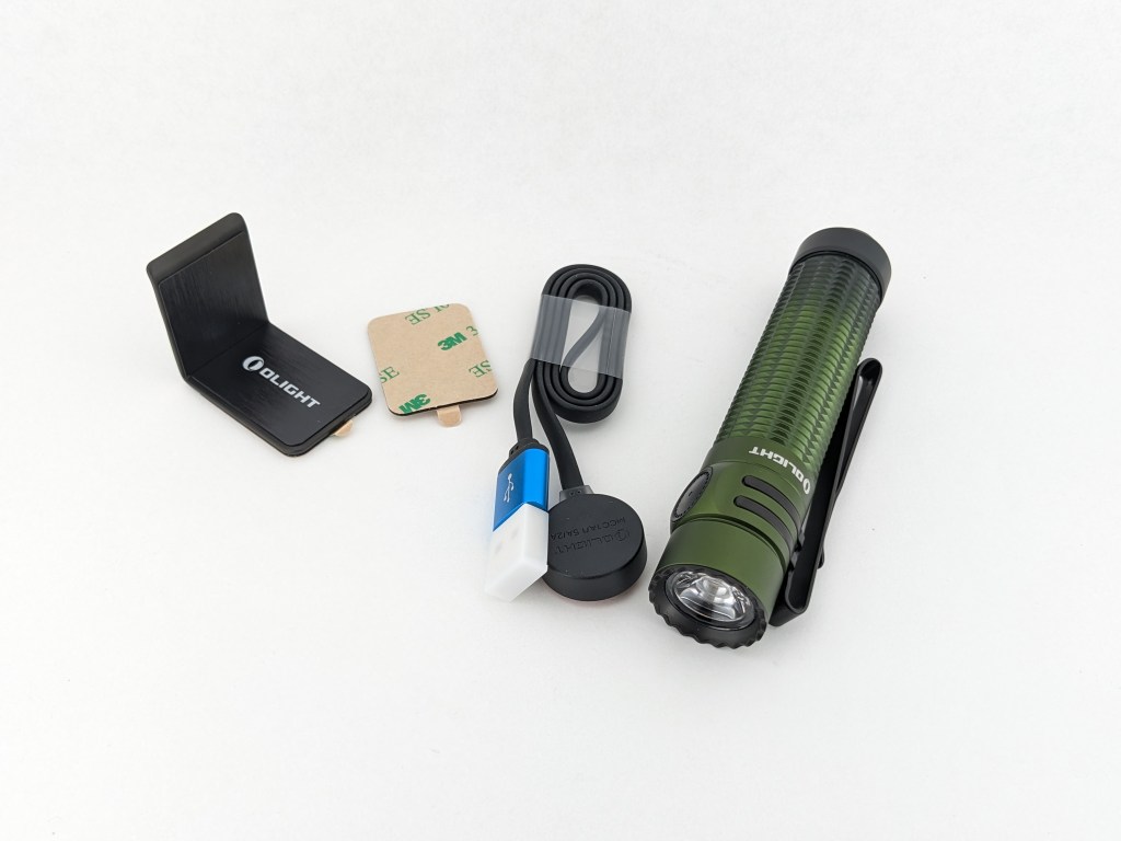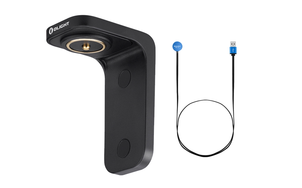 Olight also includes a small L-shaped piece of steel in the box. It’s got adhesive on one side and the idea is to stick it somewhere that you want the light to live. Then you can magnet the light to it and it will always be there ready for you to use. It’s a neat idea, but I wish it had a pass-through for charging like the dock accessory Olight used to sell (shown below).