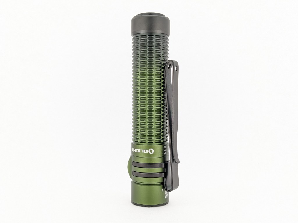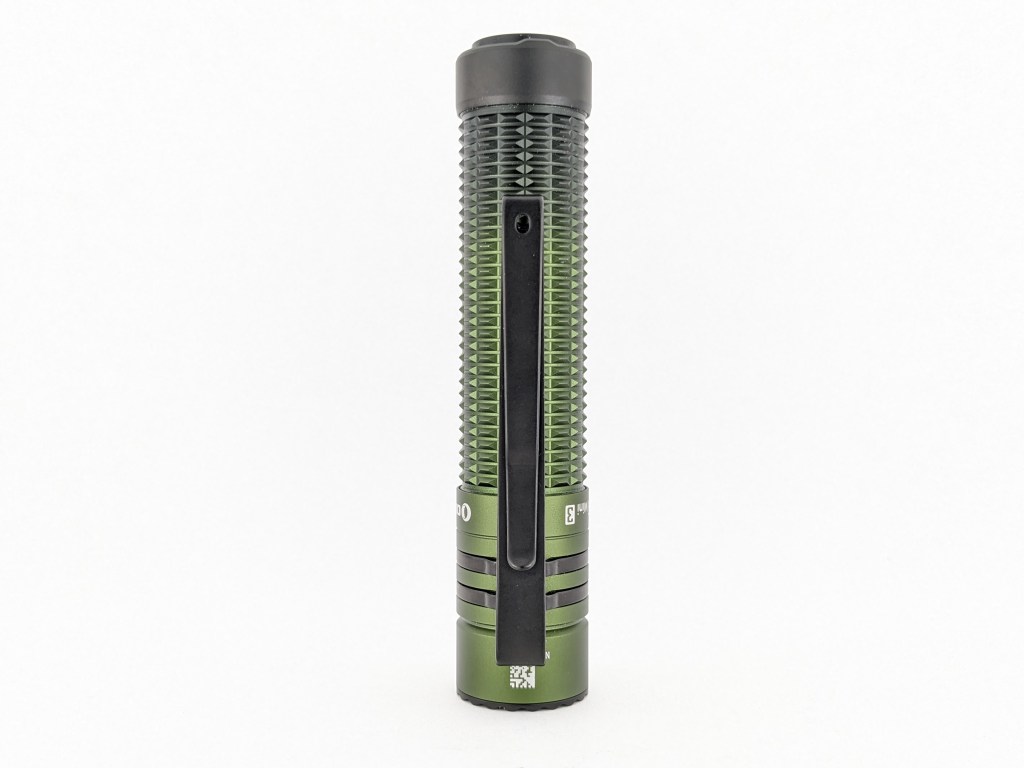 I’m tremendously disappointed by this pocket clip because it can’t attach to the tail. That means you can’t carry the light with the bezel facing down, which I strongly prefer. Doing so with this clip leaves too much of the light sticking out, and it’s hard to get your pocket edge into the clip correctly. The clip already lets you attach the light to a hat, so the extra loop back just means it will snag on seatbelts and bend/break more often. That’s happened to me twice with my Warrior 3S. Warrior Mini 2 had a great clip that could attach to the head or tail, but Olight chose to use this new, worse design on Warrior Mini 3.