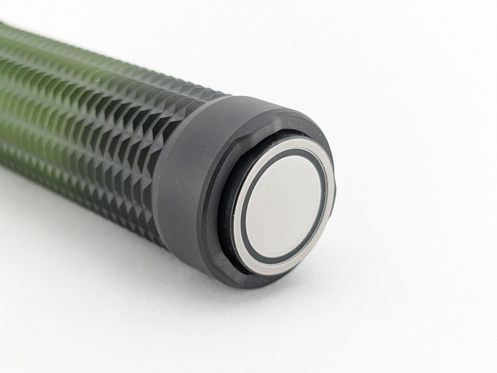 There’s a side switch that works like most other Olights. You can use it to turn the light on and off and change modes. Unlike previous versions, this switch has a hard boot. Instead of silicone, this is made of plastic or metal. There’s an LED right in the center that glows to indicate battery status.