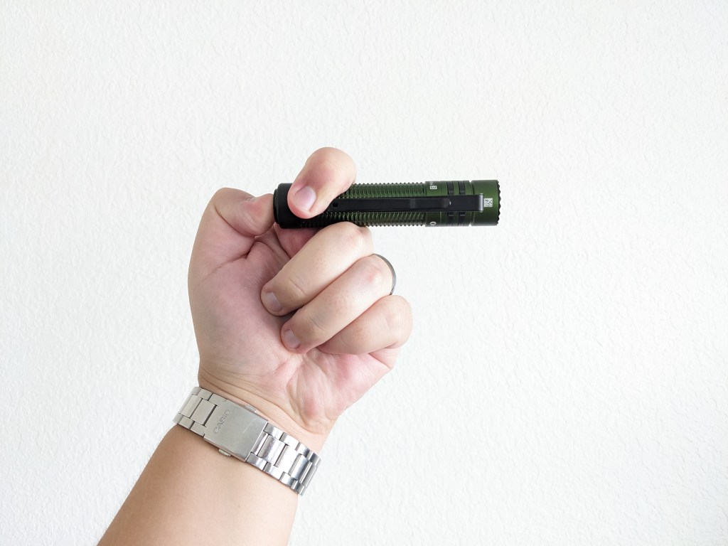 The ergonomics are fairly good. It’s just a little bit too short for me to comfortably use a reverse grip with my large hands, but a cigar grip and forward grip are both very comfortable. There are no hotspots or sharp edges, and the milling on the body tube provides plenty of grip.