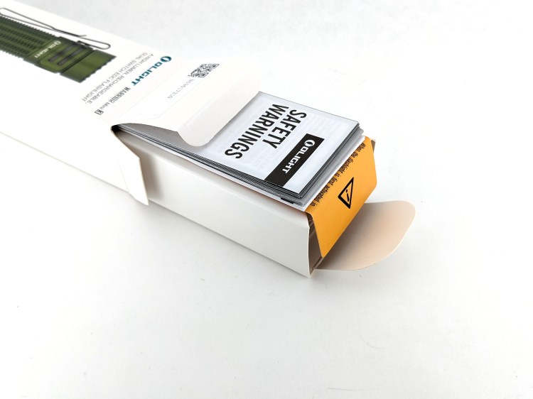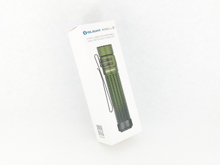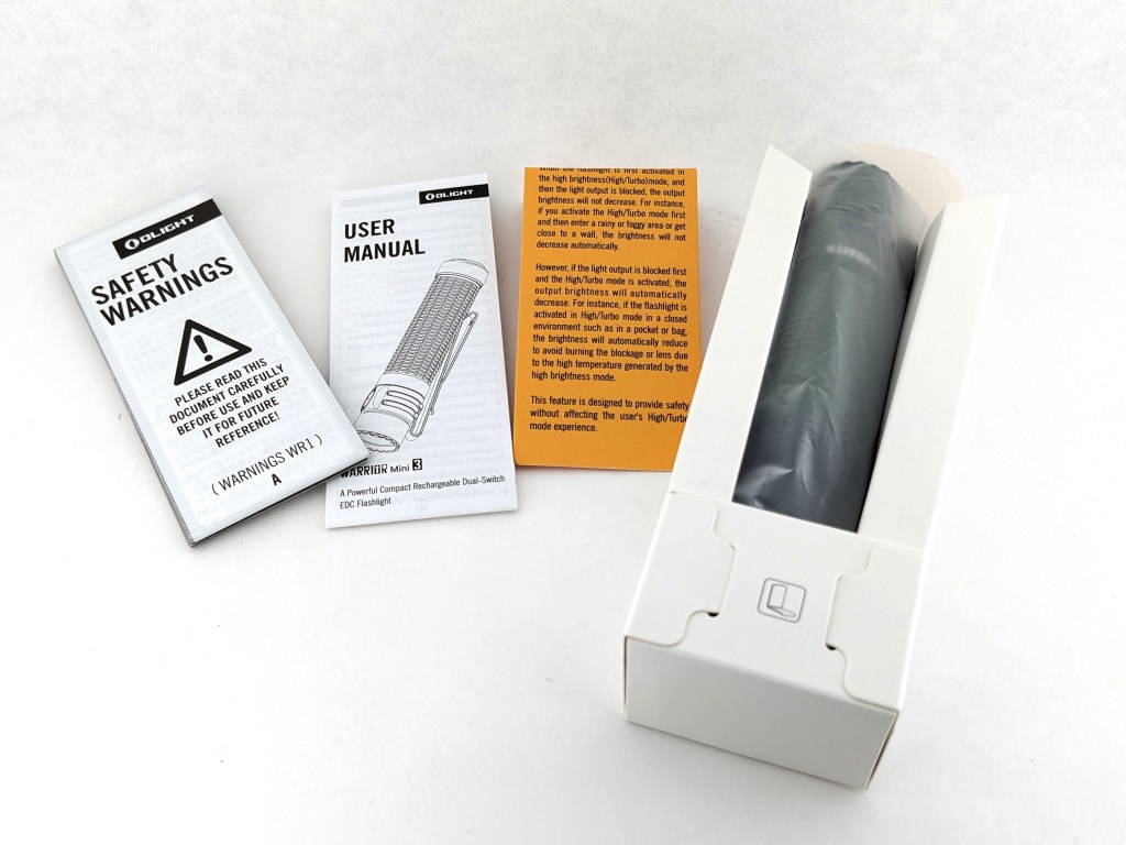 Warrior Mini 3 comes in Olight’s cheaper packaging: a nicely printed white cardstock box. There’s a folded cardstock insert that holds the light and accessories in place. It’s fairly difficult to re-pack everything into the box neatly once it’s open.