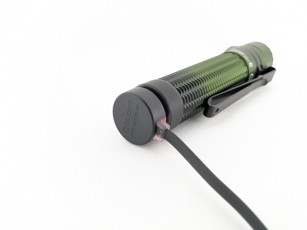 Charging is facilitated by Olight’s proprietary magnetic tailcap charging system. A USB-A charging cable is included that magnetically snaps onto the tailcap of the light. The puck has an LED indicator that glows red while charging and glows green when not charging. It’s easy to see but it’s a little too bright to have on your nightstand at night. The light is usable while charging.