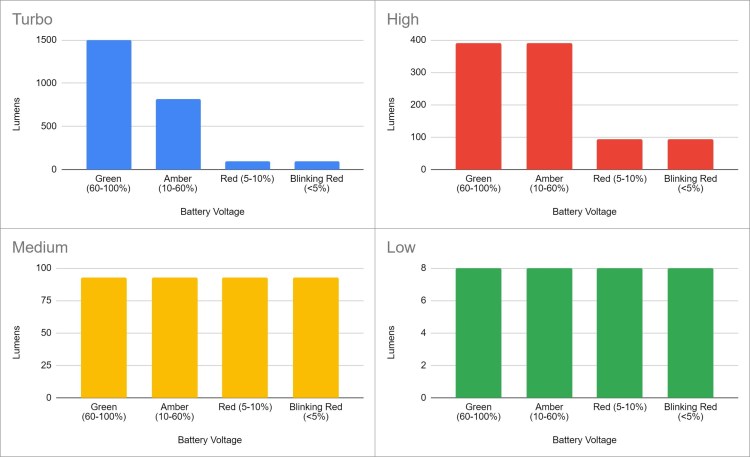 Regulation here is fairly good. Turbo and High modes are both affected by battery voltage but are only significantly affected when the battery is near empty (<10% remaining).