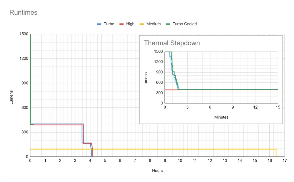 Thermal regulation: There is no active thermal regulation here. There is only a timed step-down at 1 minute from Turbo mode down to High. That means the light will perform very consistently but may also overheat in hot weather or leave some performance on the table in cold weather.