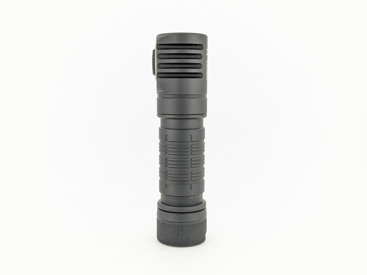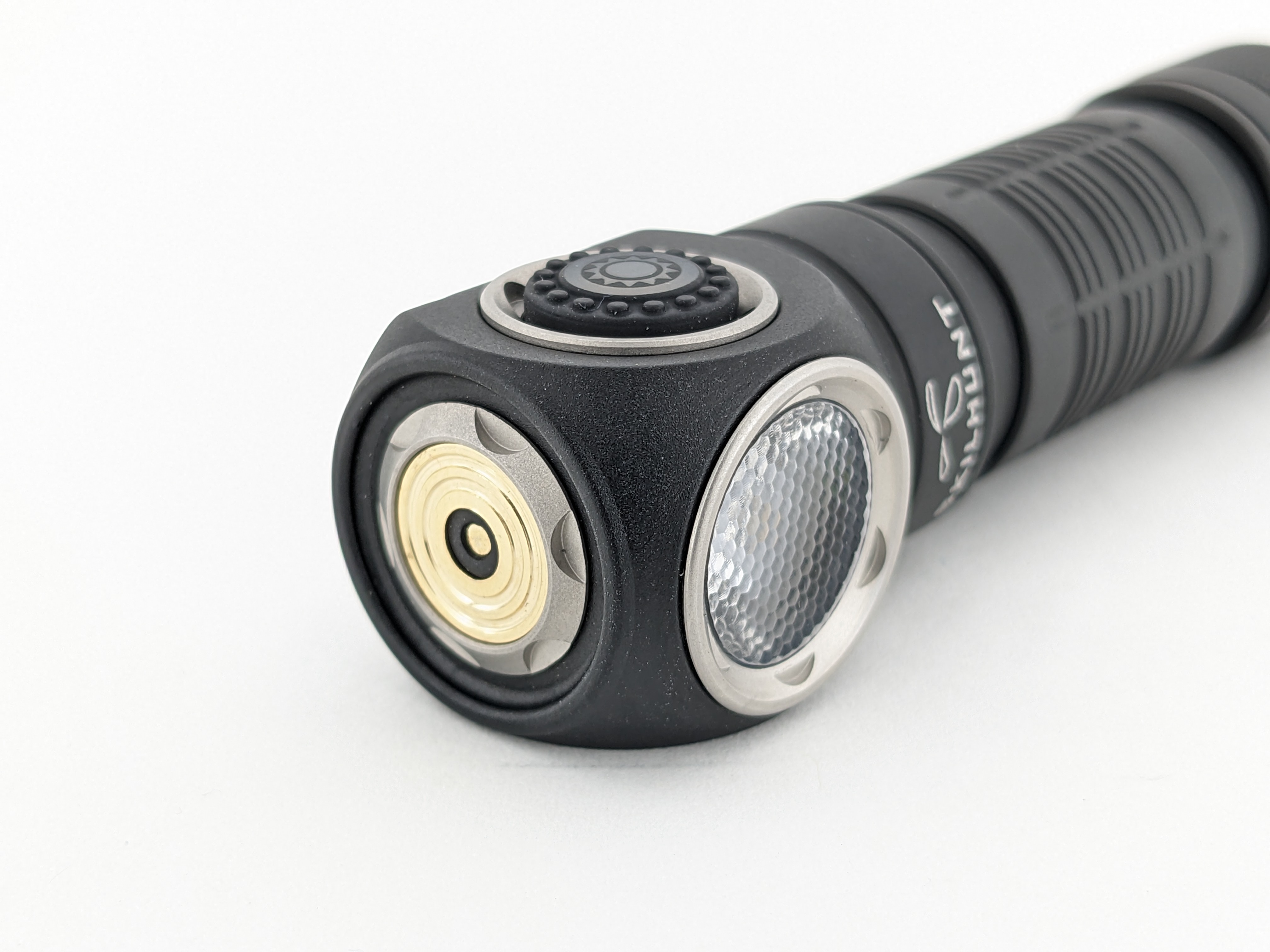 H150 uses an electronic switch mounted on the side of the head, rather than at the top of the head like many right-angle lights. This switch placement isn’t as good for handheld use but it’s much better for headlamp use. It positions the switch to be pinched between the user’s index finger and thumb, the most ergonomic switch position for a headlamp. It’s tactile, clicky, and feels nice. It’s also easy to find even in the dark.