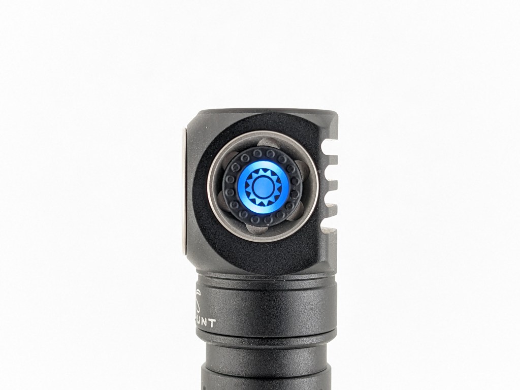 The switch is covered by a translucent rubber boot, and there’s a backlight underneath that serves as a battery indicator. It lights up for 5 seconds after the light is activated. Constant blue means the light is 80-100% charged. Blinking blue means the light is 50-80% charged. Constant red means 20-50% charge. Blinking red means 0-25% charge and it will continue blinking until the light is turned off. This battery indicator system requires a little bit of memorizing but it works well enough. It only works with Li-ion 14500 cells though, not any other chemistries (Alkaline, NiMH, etc).