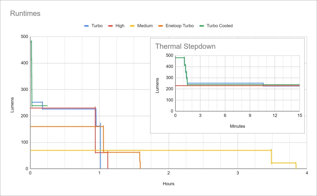 Thermal regulation: There is a timed stepdown from Turbo and no other thermal regulation whatsoever. I would like to see active thermal regulation in a future version that responds to temperature to maximize brightness.