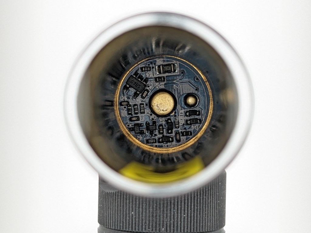 I was able to remove the bezel with a super grippy glove. Underneath the optic, I found a little white cone of unknown purpose and a new MCPCB design. This design screws into the shelf rather than relying on the pressure of the optic, which is an improvement over older Skilhunt designs. I think this is a special size of MCPCB so any emitter swaps will probably have to be done via reflow. You can also see the 519A LED here.