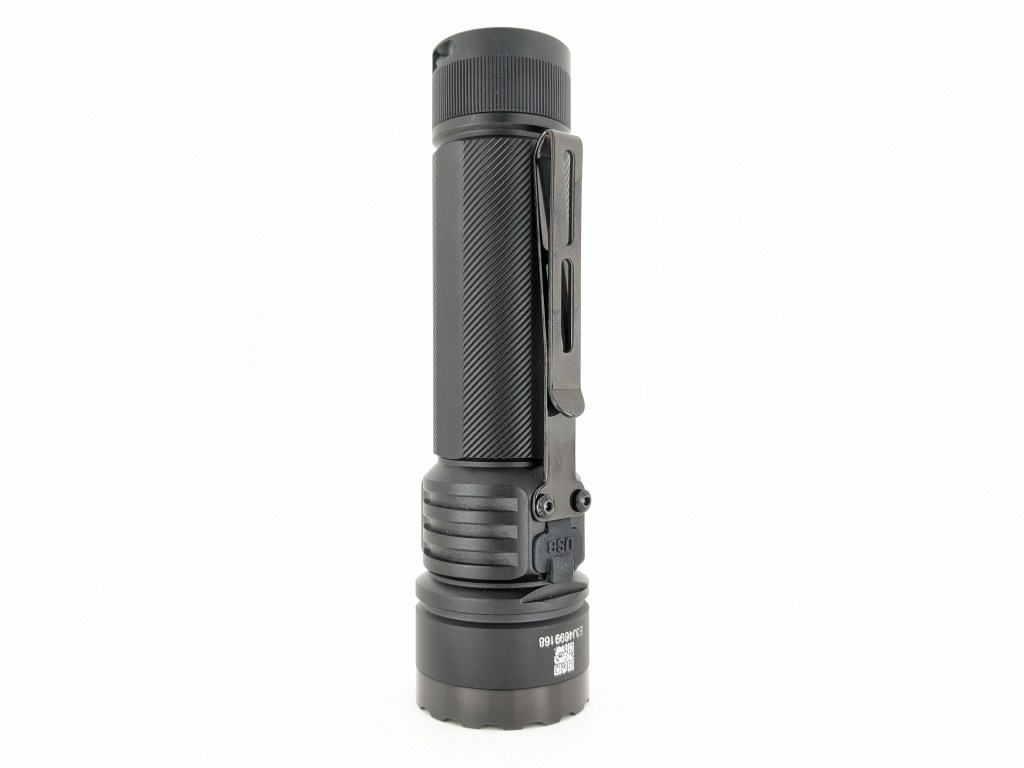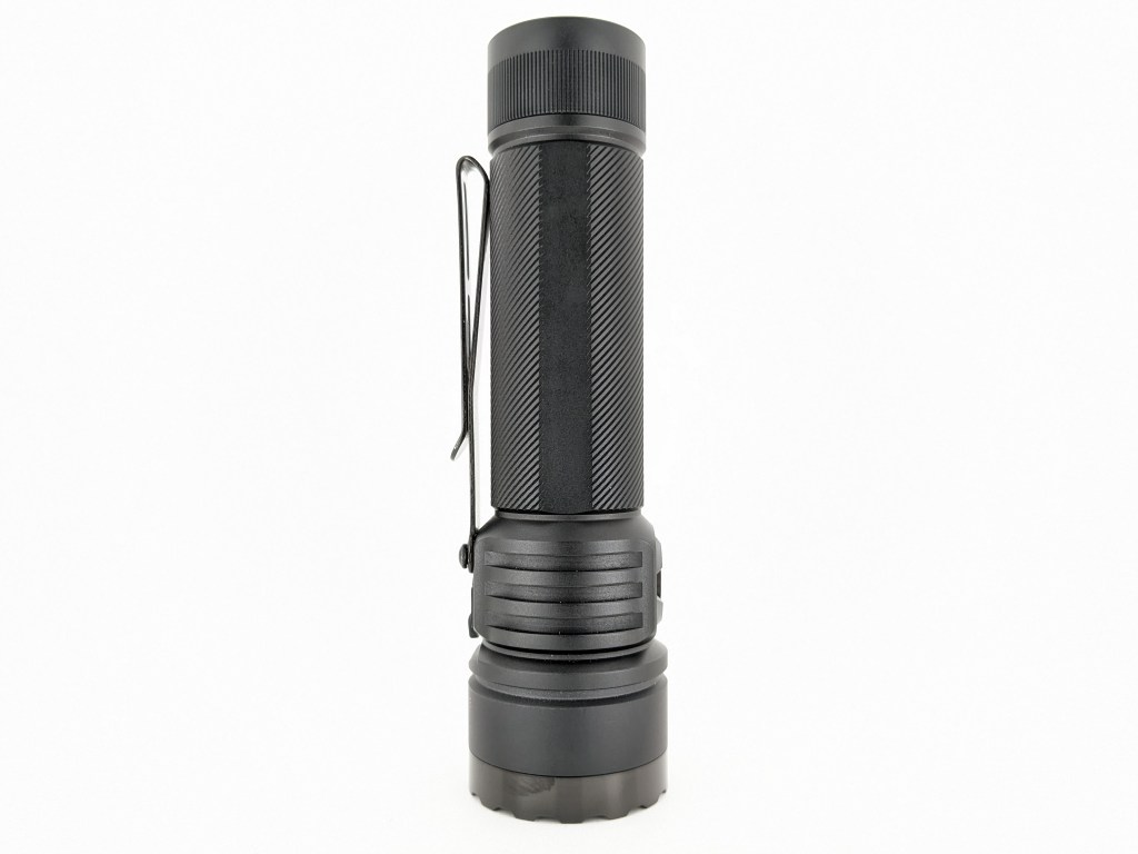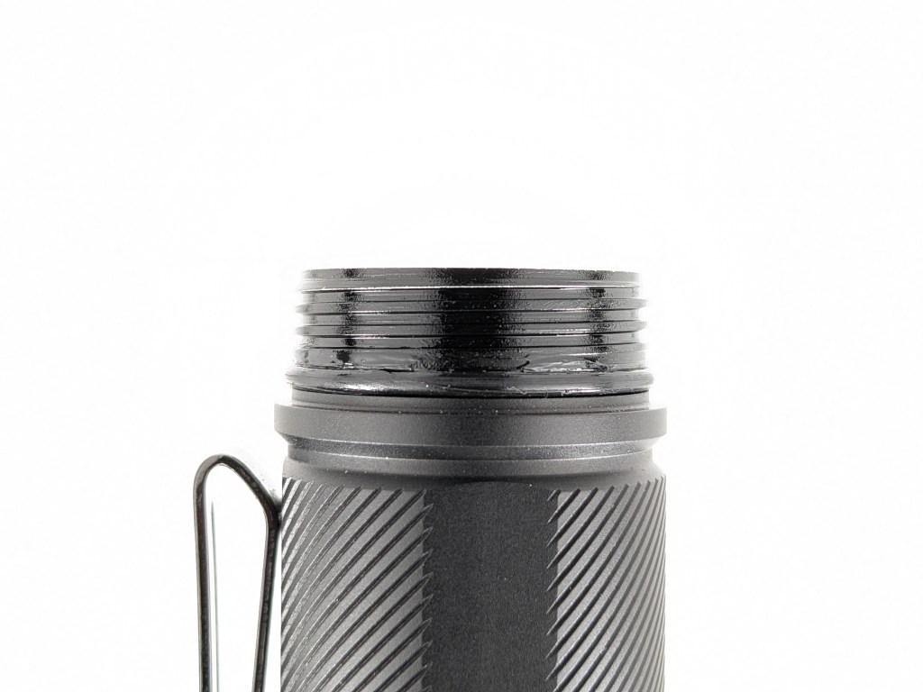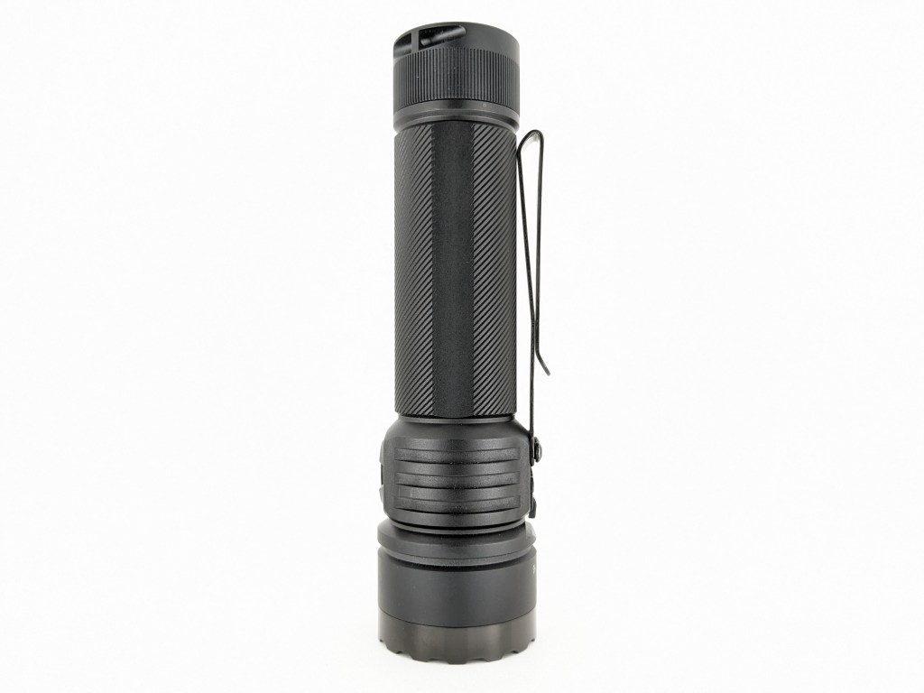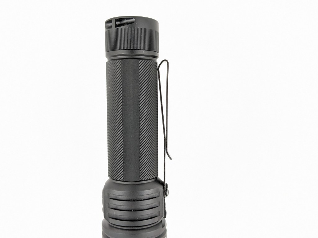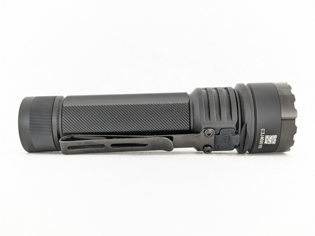 This is a large light but it still carries well. The clip attaches to the head, goes back toward the tailcap, and then loops forward. This makes it LOOK like the bidirectional clips that have become popular recently and allow you to clip the light to a hat, but tend to snag on things. While you technically could clip it to a hat, the light is too heavy, and I don’t think that’s what’s really happening here. Notice how the outermost loop points down? That’s just like any regular pocket clip. It’s not looped back toward the tailcap like most bidirectional clips. If you’re someone who refuses to use bidirectional clips because they snag on things like seatbelts, fear not. That shouldn’t be an issue here.