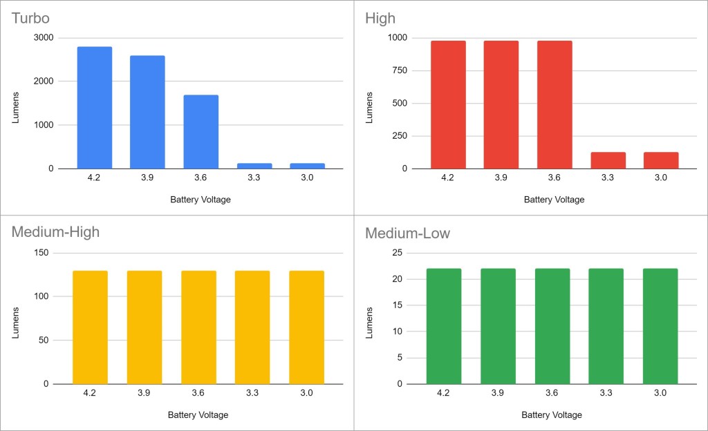Regulation performance is good/average. Only Turbo and High modes are affected by cell voltage, and even then they’re only significantly affected when the cell is low.