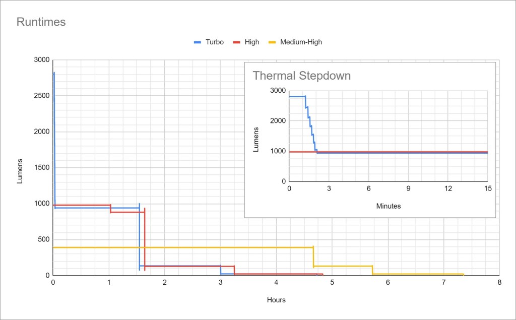 Thermal regulation: Timed step-down from Turbo only. No active thermal regulation. That means the light will perform very consistently but may also overheat in hot weather or leave some performance on the table in cold weather. It got concerningly hot in my Turbo and High runtime tests so I turned on a fan for those after a few minutes.