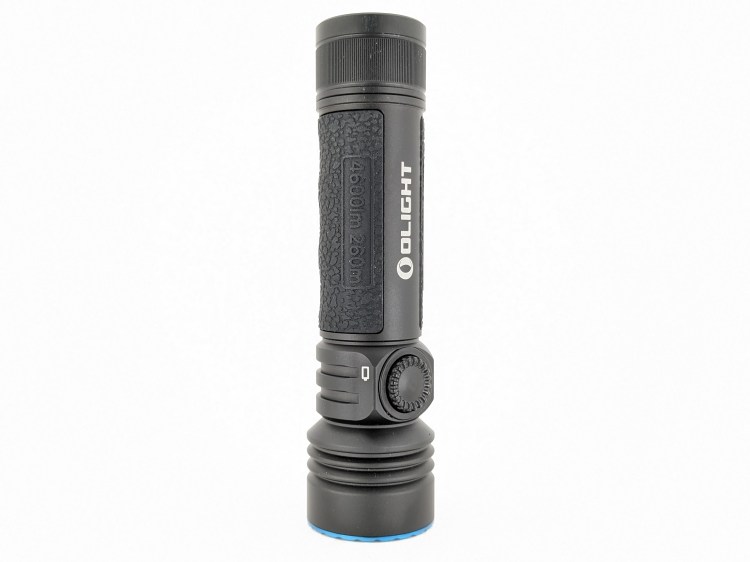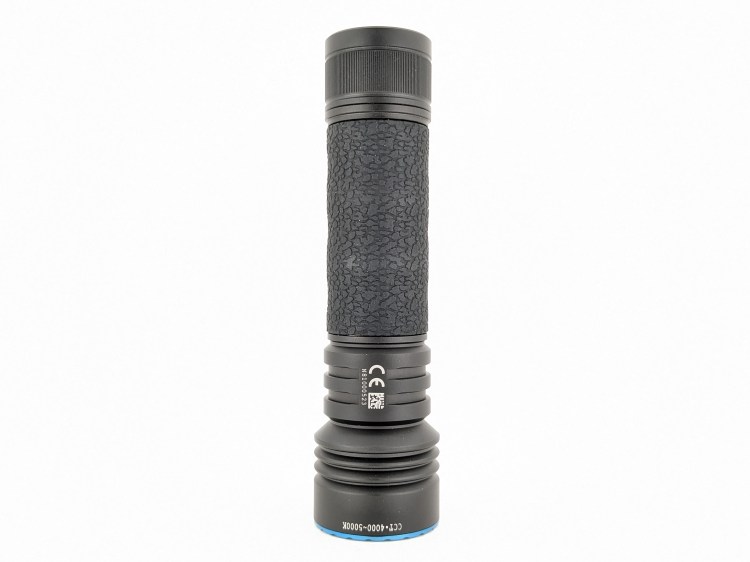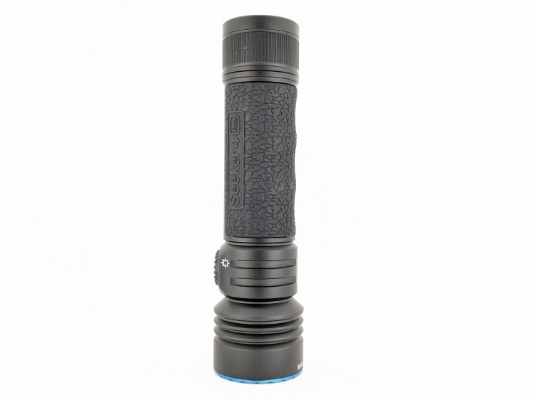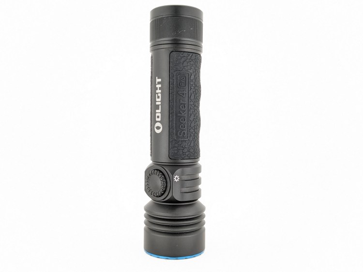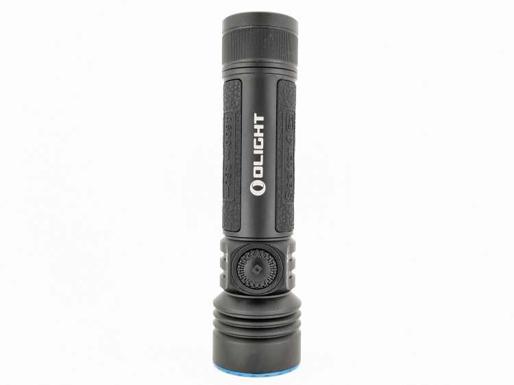 This design is very similar to previous Seekers with rubberized grips on the body tube, a large button, and a flared head. I like the clean black look but I don’t care for the blue aluminum accents Olight puts on their black flashlights, the bezel in this case.