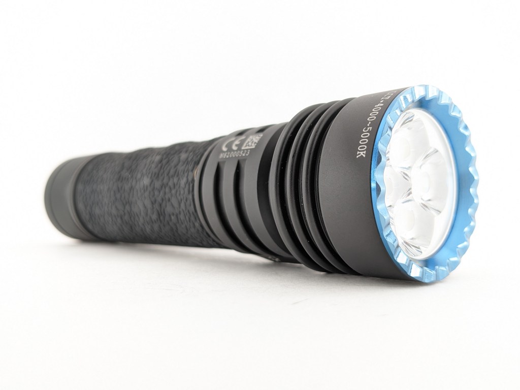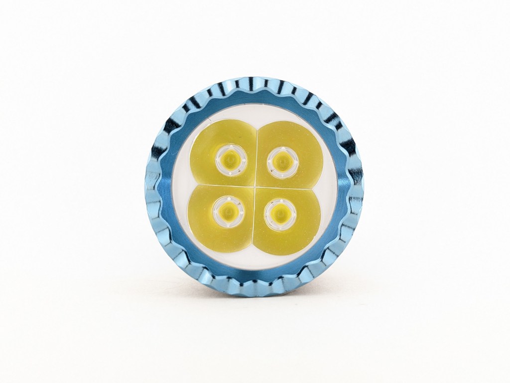 Olight doesn’t name the emitters used in Seeker 4 Pro, but they’re available in cool white or neutral white, both standard CRI. I have the neutral white version. They’re domed and 3535 size. They sit behind a custom quad TIR optic (not an off-the-shelf Carclo like you see on many other lights). This produces a fantastic beam. Unfortunately, I was unable to remove the bezel with super grippy gloves, so it may be difficult to do emitter swaps on this light.