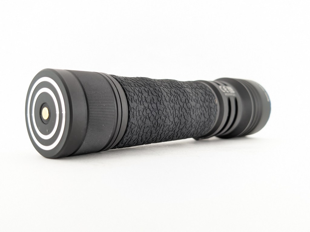 Around the switch there are brightness (left) and battery (right) level indicators. They work fine but I wish they were a little brighter so I can see them during the day before I go into a dark space. The marketing material makes a big deal about using “laser micro-perforations” in the aluminum ring to let the indicators glow through but it’s way dimmer than previous generations and I’m sure it’s much more expensive too. I don’t see how “laser micro perforation technology” is impressive or useful here and I like the older indicators better.