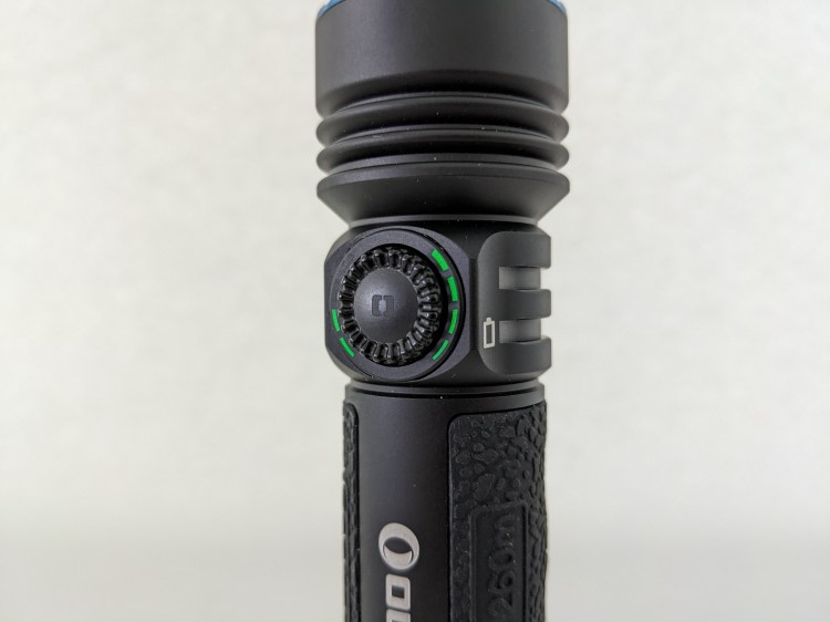 There are four battery indicators on the right side of the switch. Each one indicates 25% capacity and the bottom one will turn red when the battery gets critically low. They glow when the light is charging, when removed from the holster, or when you press or rotate the knob. It’s easily glanceable and intuitive. I like this so much more than the “click 3x from off and count the blinks to check battery voltage” that some other lights have. I only wish they were brighter.