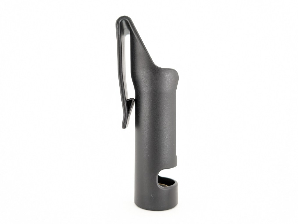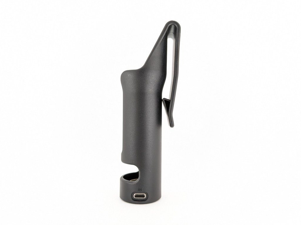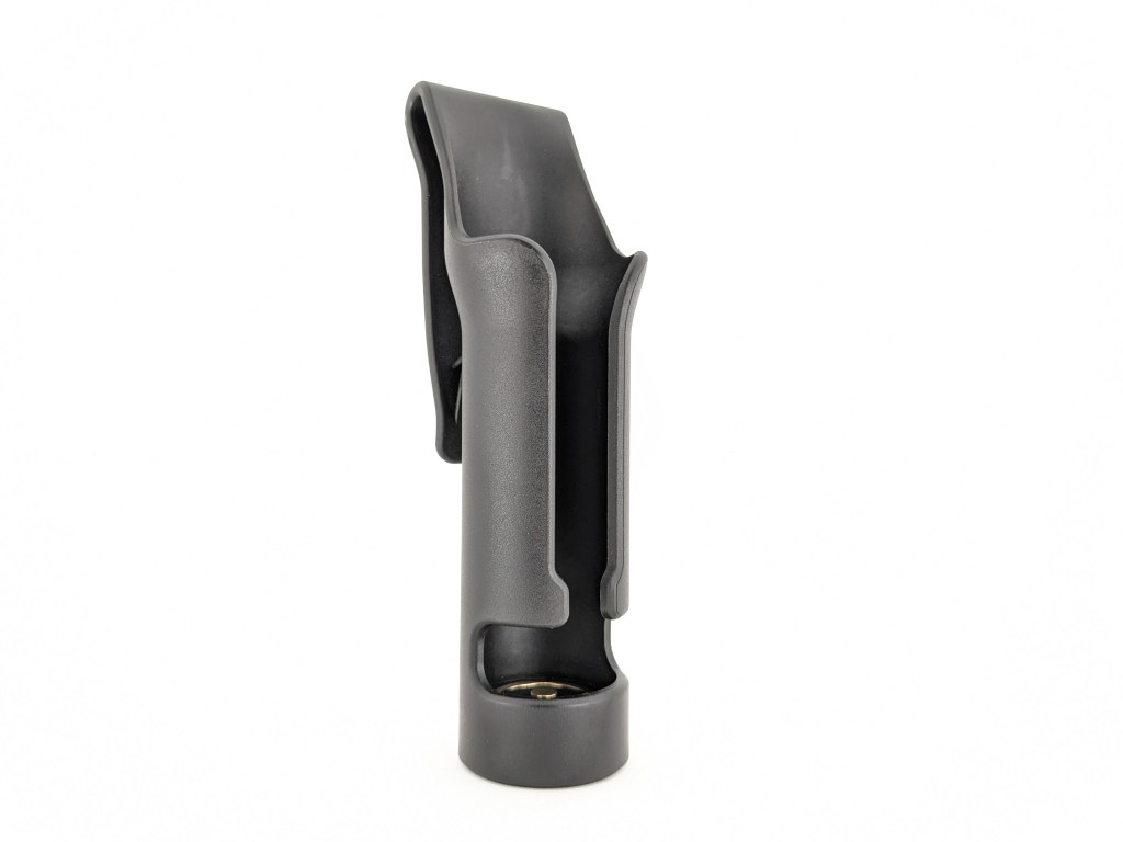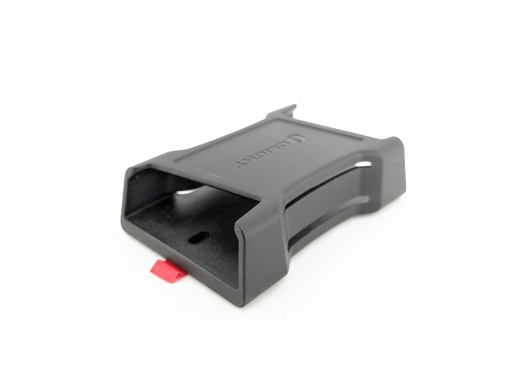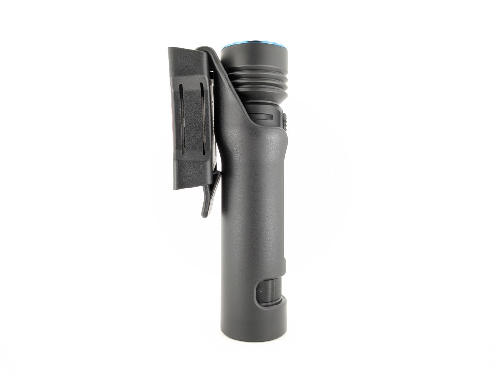 There’s one big carry method included: the vertical belt holster. It’s made of a slightly flexible plastic and it’s all one piece, including the belt loop. It’s a complete re-thinking of a belt holster compared to the typical nylon and velcro contraption you usually picture as a flashlight holster. A horizontal holster will be available as an optional accessory.