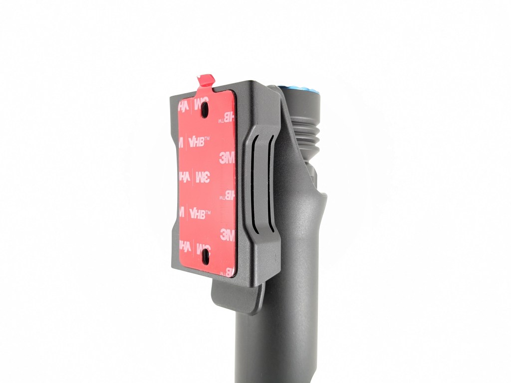 It also includes a wall mount for the holster. It’s a sort of slot that the holster clips onto. There’s adhesive on the back (a spare is also included) and two screw holes for mounting (screws and drywall anchors are included). It could be a permanent charging station for the light by the back door or on your center console so you know it’s always charged. Or it could be a handy place to store the light and holster when they aren’t on your belt.
