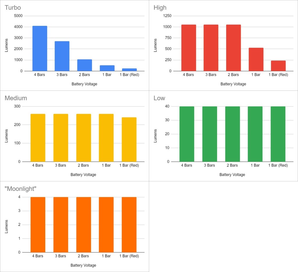 Disclaimer: All of my measurements are taken at turn-on. Lumen measurements were taken on a Texas Ace 3.5″ Lumen Tube. A candela measurement was taken at 10 meters with an Opple Light Master III on the highest brightness, and other candela figures were calculated relative to that. CRI, CCT, & DUV data were taken for each mode from a few feet away at the center of the hotspot with the Opple Light Master and Waveform DUV Calculator. Runtime tests were performed with the Ceilingbounce app on my smartphone. All of these tests were performed with a fully charged included battery unless otherwise specified. I cannot measure moonlight directly, so moonlight readings are calculated based on the brightness relative to the next-lowest mode. None of this is professional equipment, so take all of these measurements with a grain of salt.