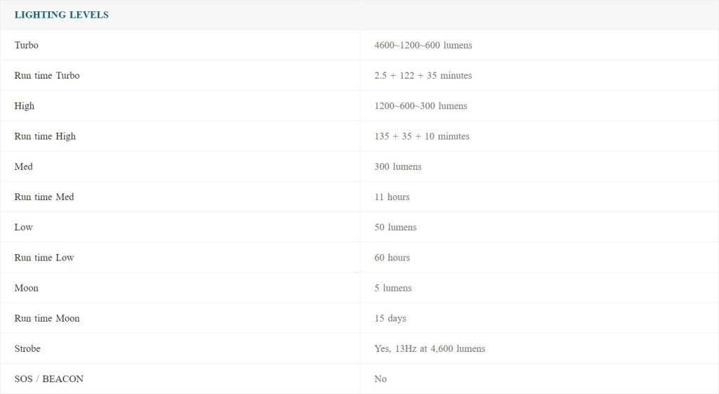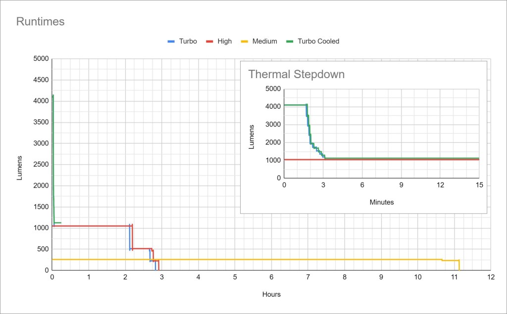 Thermal regulation: Timed step-down from Turbo only. No active thermal regulation. That means the light will perform very consistently but may also overheat in hot weather or leave some performance on the table in cold weather.