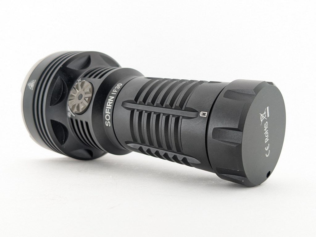 IF30 has a short body tube with a wide head to fit the center throw reflector and the bank of surrounding flood LED’s. That makes it seem a bit short and stubby compared to other lights of a similar diameter, kind of like a Wurkkos TS11 scaled up by ~80%.