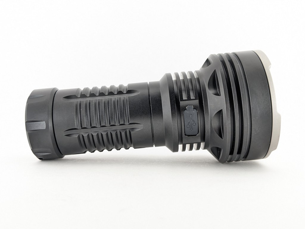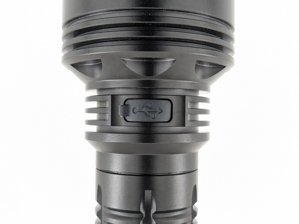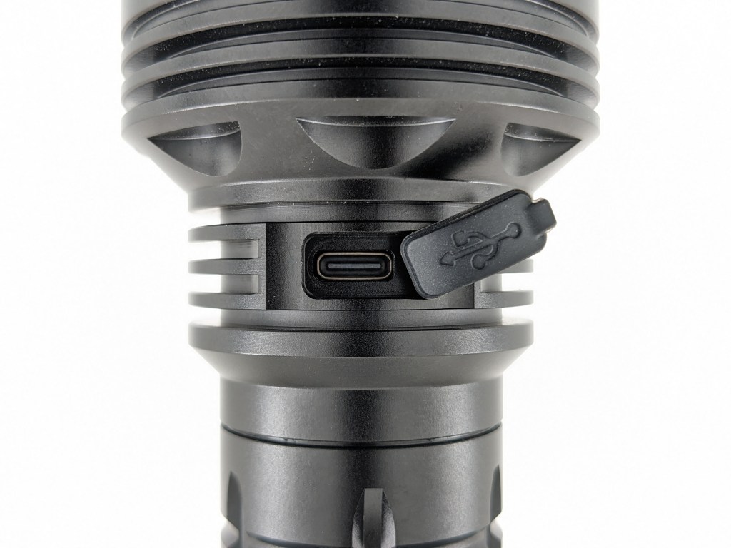 Charging is facilitated by a USB-C port on the side of the head, sealed with a rubber port cover. Both A-to-C and C-to-C charging cables work just fine. The light is fully functional while plugged in, but brightness is limited if the battery is disconnected. There is a powerbank function and I was able to charge my smartphone directly from the flashlight.