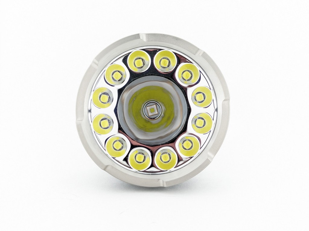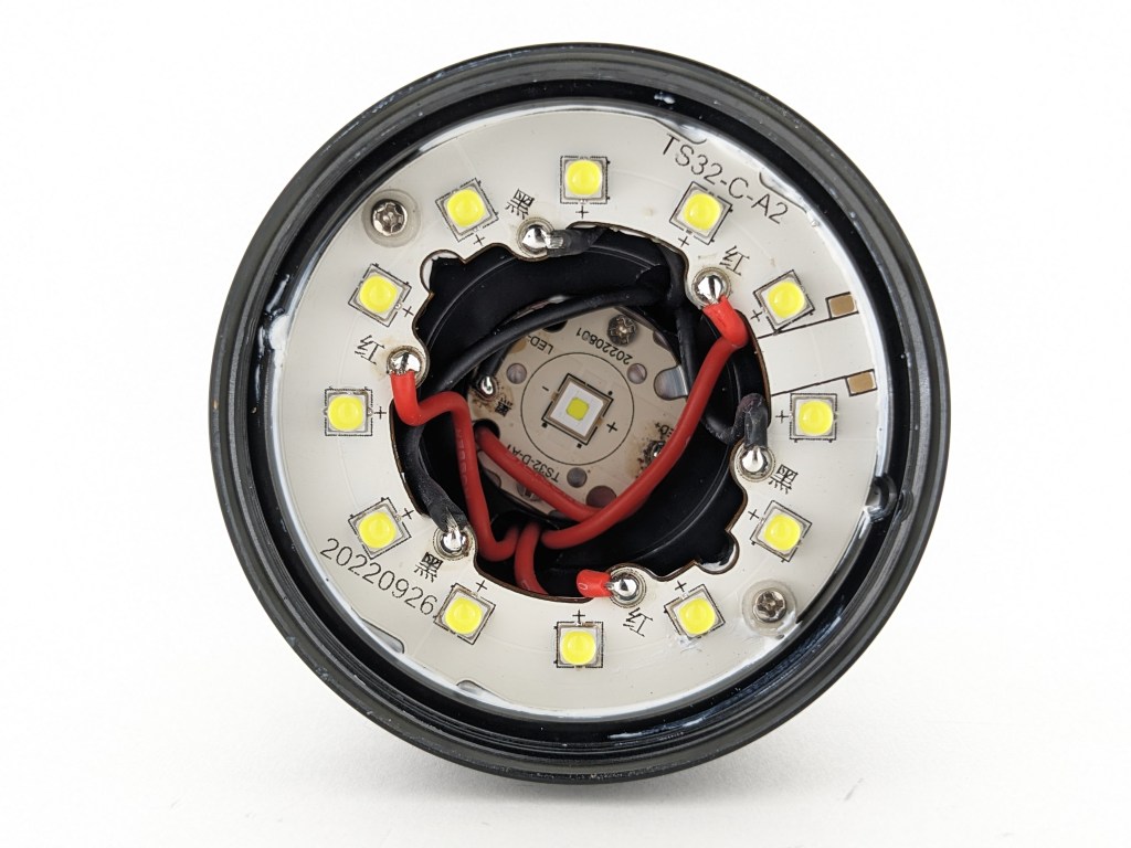 IF30 has two groups of emitters, a flood channel and a throw channel. All the LEDs sit under a multi-level plastic reflector. All the flood LED’s are on one ring PCB and the throw LED is on a separate PCB that’s deeper in the head of the light. It’s very fiddly to get the reflector out and to put it back in place so I don’t recommend disassembling unless you absolutely have to. I believe the reflector and MCPCB’s are exactly the same ones used in Wurkkos TS32, because both MCPCB’s say “TS32” on them.