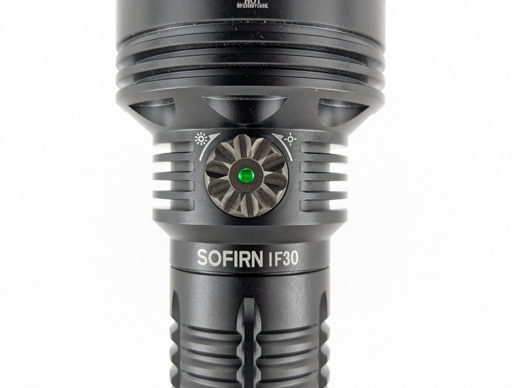 IF30 uses one 32650 battery. That’s a weird size that I’ve never come across before and the included battery has been under a lot of scrutiny by users with battery testing equipment and it appears to be relatively low quality, not rated for the high draw of this light, and of a fairly low capacity/size ratio. I wish Sofirn had included a better cell or used a more common battery format. It’s a button-top cell and I’m not sure whether it’s got any protection circuitry.