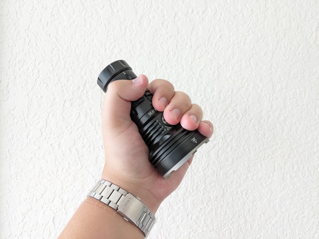The ergonomics are decent. The 32650 battery means the body tube is fairly thick and easy to hold onto. It’s a bit short though so my pinky would sometimes hang off the end of the light while my thumb was on the button.