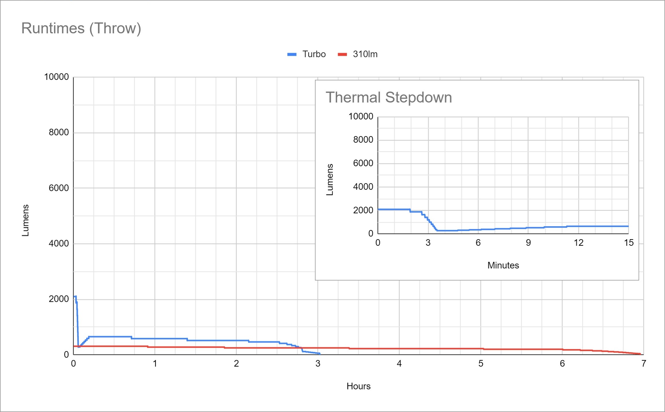 I was only able to test the regulation performance on Turbo because there are no stepped modes. You can also look at the medium-ish brightness runtime tests to see how well-regulated it is without any need for thermal throttling. The bottom line is the regulation performance is poor.