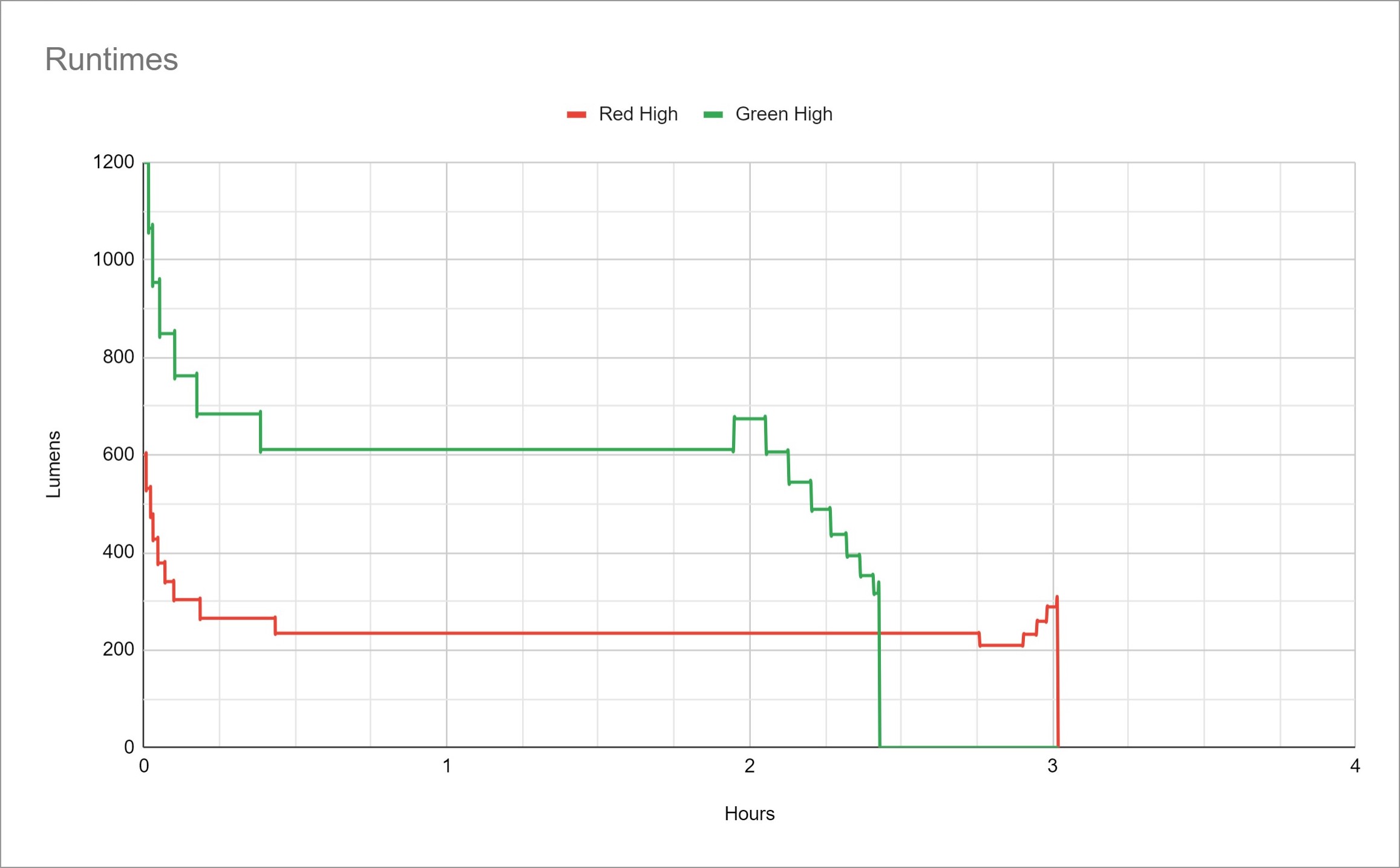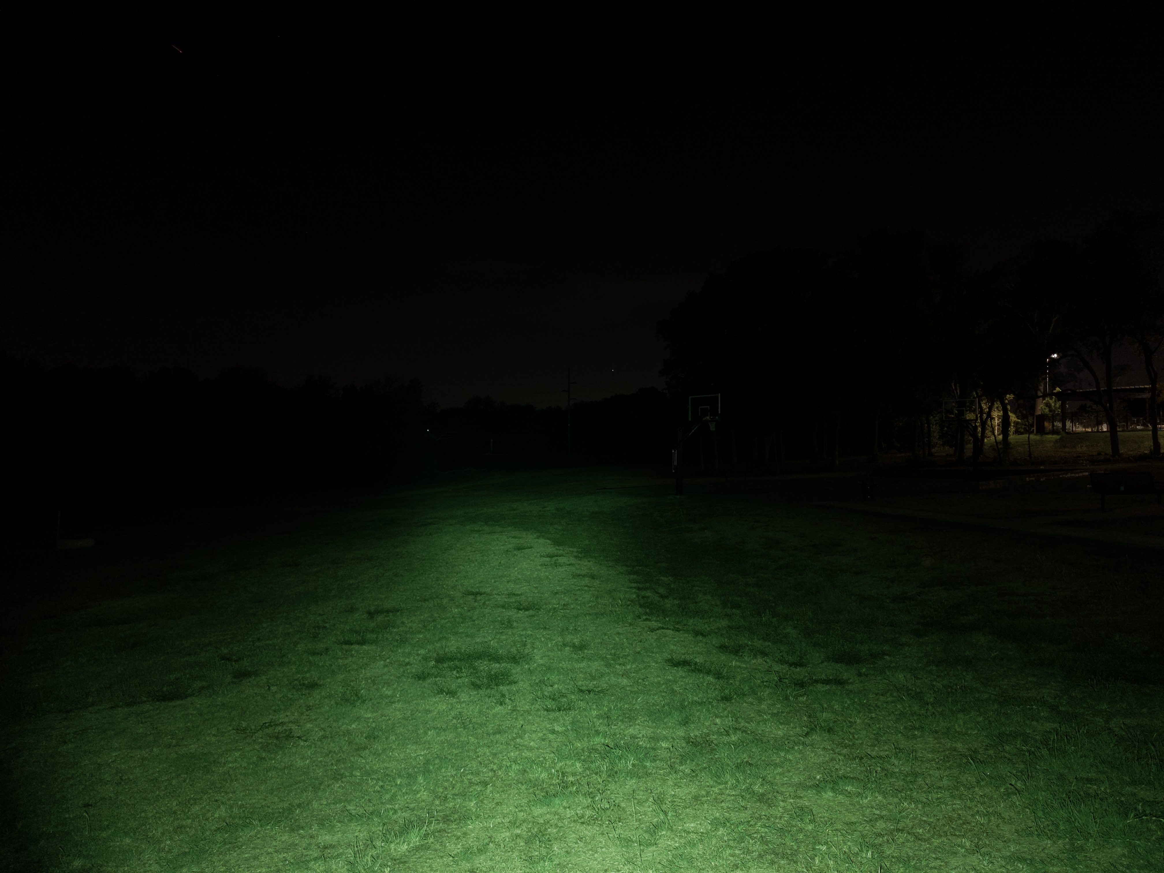 Disclaimer: All of my measurements are taken at turn-on. Lumen measurements were taken on a Texas Ace 3.5″ Lumen Tube. A candela measurement was taken at 10 meters with an Opple Light Master III on the highest brightness, and other candela figures were calculated relative to that. CRI, CCT, & DUV data were taken for each mode from a few feet away at the center of the hotspot with the Opple Light Master and Waveform DUV Calculator. Runtime tests were performed with the Ceilingbounce app on my smartphone. All of these tests were performed with a fully charged included battery unless otherwise specified. I cannot measure moonlight directly, so moonlight readings are calculated based on the brightness relative to the next-lowest mode. None of this is professional equipment, so take all of these measurements with a grain of salt.