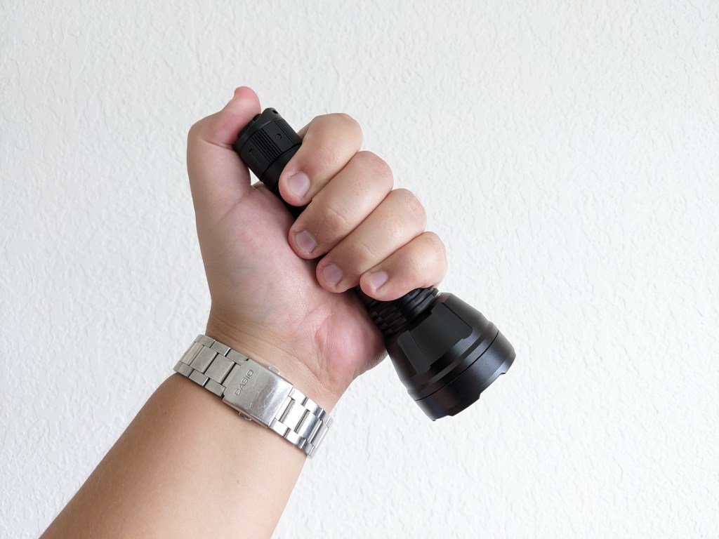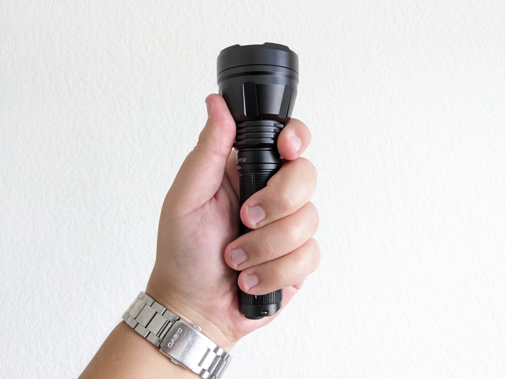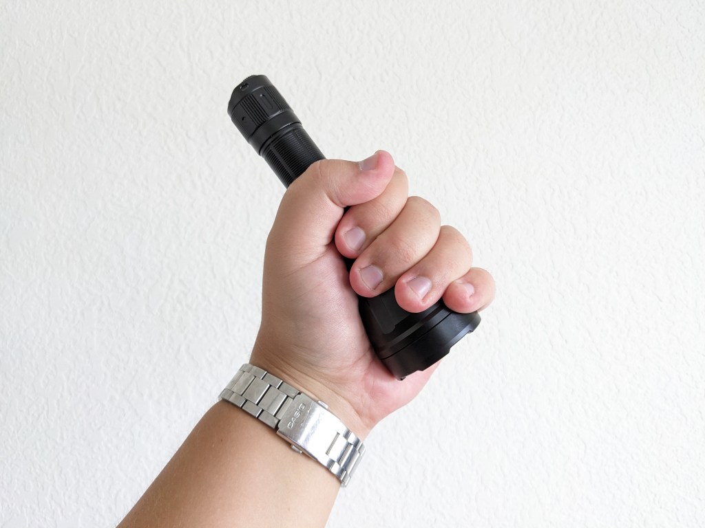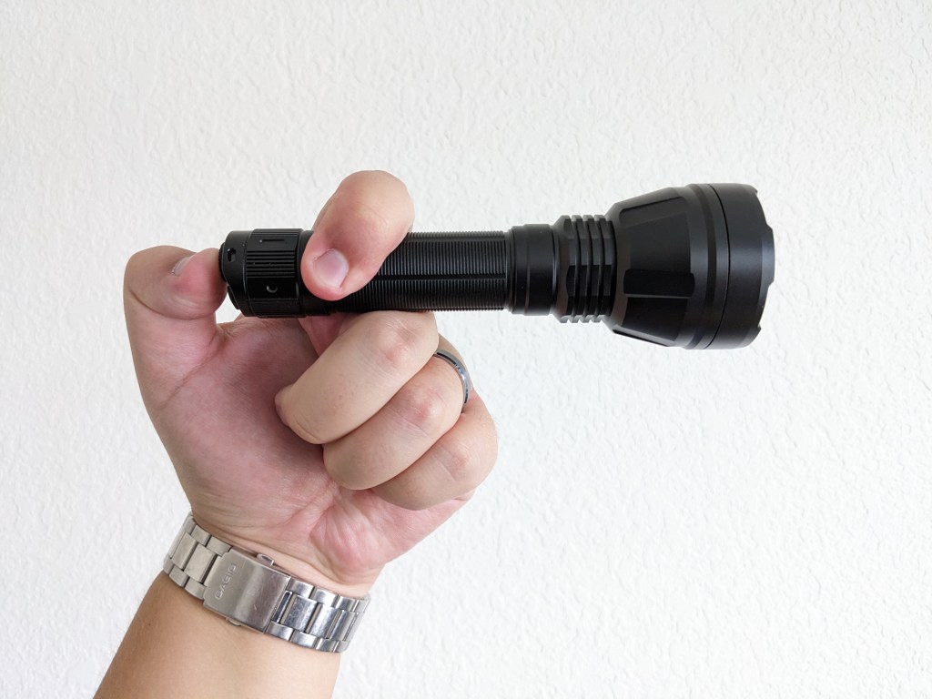 Fenix did an excellent job on HT32’s ergonomics. All of the milling is the perfect balance between grippy and comfortable. There are no sharp edges or hotspots anywhere. It works best in a reverse or cigar grip, but the forward and neck grips work too if you change modes with the other hand.